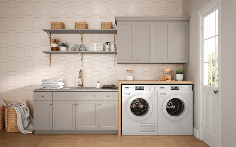 Spectra Door Style in Mineral Finish | This functional laundry space features Spectra cabinets in the Mineral finish. This design delivers an appealing look combined with useful space to meet your laundry needs