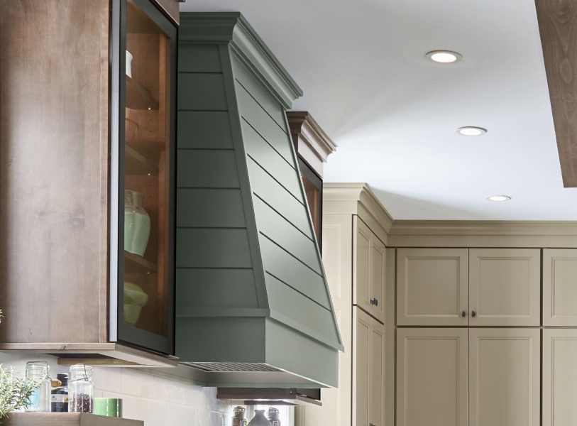 Shown in Bella quartersawn oak Cobblestone; Mission Flat Panel maple Chai Latte Classic; Bellagio stainless steel with Frosted glass